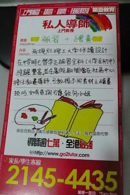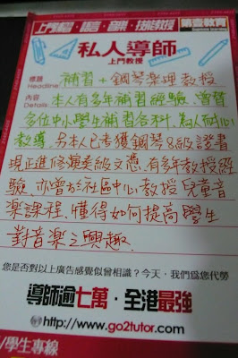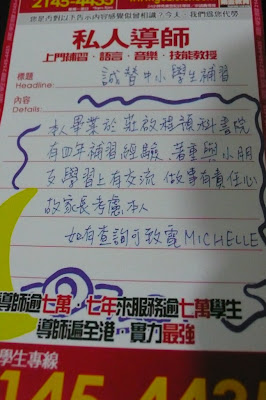 日轉星移. 以前個體戶既時代, 已經一去不復返. 家陣補習已經成為一行專業, 要搞連鎖店式. 就連上門補習都一樣. 而家要呢d 告示, 唔使再抄低 – 個度有一疊任你拎. 好似去揀女咁, 你鍾意邊條, 揀邊條.